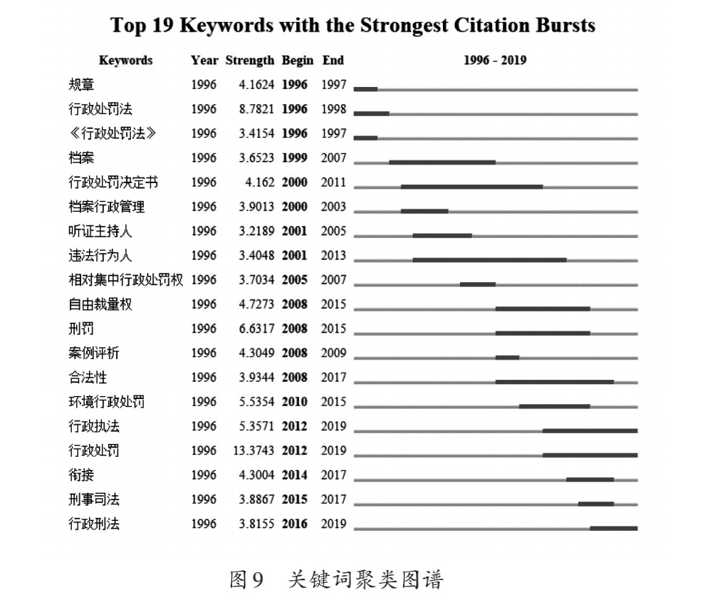 关键词高突现词表可以显示出某一关键词出现的开始时间和结束时间,由此可以得出这一关键词研究的兴起或者衰落情况,通过分析出现和结束时间较近的关键词可以了解行政处罚法研究的重点和热点问题。在关键词共现图谱的基础上可以直接得出关键词高突现词表图10。