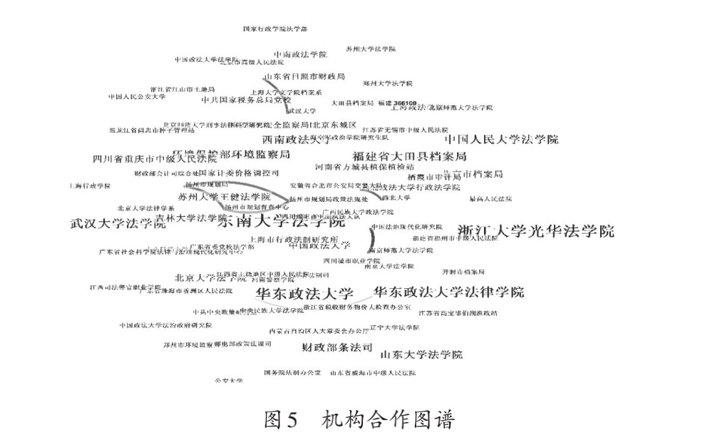 从机构合作图谱中可以得到机构或者作者所隶属的机构的发文频次,进而了解该研究领域的核心机构。选择节点类型为机构,数据阈值设置为“top100%”,即对每个时间分区内出现的所有机构进行分析,其他参数设置为默认值,运行citespace,获得机构合作图谱图5。如图5所示,字体的大小代表机构发文量的多少,连线表示机构之间的合作关系,连线的颜色越深表示合作的时间越近。由图可知,在行政处罚法的研究领域最具代表性的核心机构有东南大学法学院、浙江大学光华法学院、华东政法大学。根据已有资料可知,熊樟林、周佑勇等作者所属单位为东南大学法学院,章剑生、胡建淼等作者所属单位为浙江大学光华法学院,练育强、沈福俊等作者所属单位为华东政法大学。此项结果与作者合作图谱中所得结果具有一致性,说明关于作者方面的研究显示的结果具备一定的合理性。