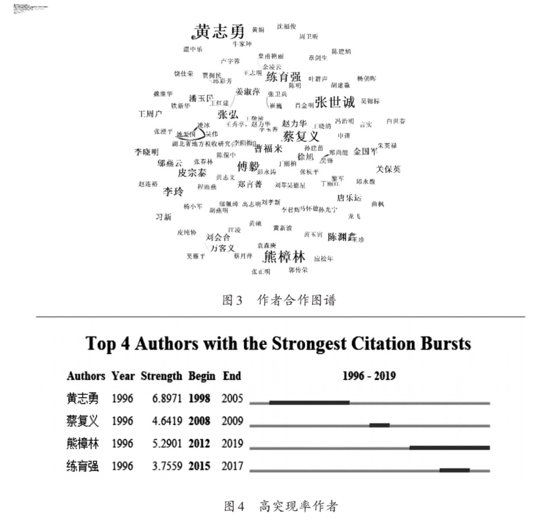 从作者合作图谱中可以得到作者发文频次,进而了解该研究领域发文作者情况。将时间分区设置为1年,选择节点类型为作者,数据阈值设置为“top100%”,即对每个时间分区内出现的所有作者进行分析,其他参数设置为默认值,运行citespace,获得作者合作图谱图3和高突现率作者图4。如图所示,字体的大小代表作者发文量的多少,连线表示作者之间的合作关系,连线的颜色越深表示合作的时间越近。