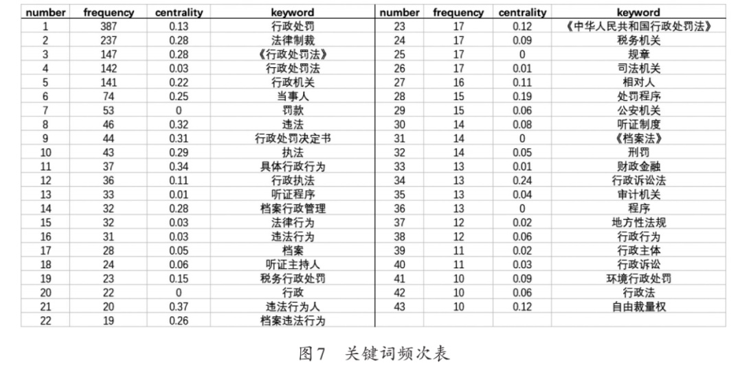 由关键词频次表可知,“违法行为人”“具体行政行为”“违法”的中心度最高,分别是0.37、0.34、0.32,表示在行政处罚法的研究中是重要的关键词。如图(表)所示,“行政处罚”“行政处罚法”等与本研究主题一致,暂不做具体分析;“行政机关”“行政主体”“公安机关”“当事人”“相对人”等研究了行政主体及相互之间的关系;“罚款”“执法”“行政执法”“具体行政行为”等研究了行政行为及相互之间的关系;“听证程序”“听证主持人”“听证制度”等探讨了有关行政处罚法中的听证制度;“档案行政管理”“档案”“档案法”“档案违法行为”等分析了行政处罚法与档案管理及相互之间的关系;“司法机关”“行政诉讼法”“行政诉讼”等关注了行政处罚法与行政诉讼及相互之间的关系;除此之外,还有“地方性法规”“自由裁量权”等有关行政处罚法的其他相关问题。显然,目前关于行政处罚法的研究所涉及的内容较为广泛、涵盖的主题多种多样。