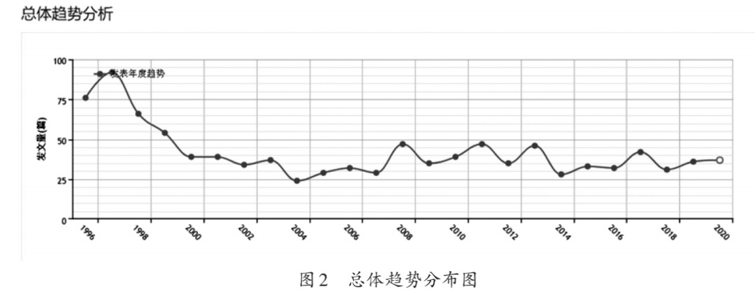 图2总体趋势分布图显示了自1996-2019年期间各年行政处罚法相关研究的发文数量(2020年为预测数据),通过该图可以看出该领域研究的总体趋势。如图所示,关于“行政处罚法”的研究可以分为三个阶段。第一阶段1996-1997年是快速发展阶段,原因在于1996年是行政处罚法颁布与施行之年,学界对于该问题的研究关注度较高。第二阶段1998-2000年是缓慢下降阶段,这一时期研究数量有所减少,其原因可能是行政处罚法的施行已步入正轨,相关制度处于实践检验阶段,学者处于持续观望的状态。第三阶段2001-2019年是稳定发展阶段,这一时期每年的发文数量除个别年份有所波动外,整体相对稳定。