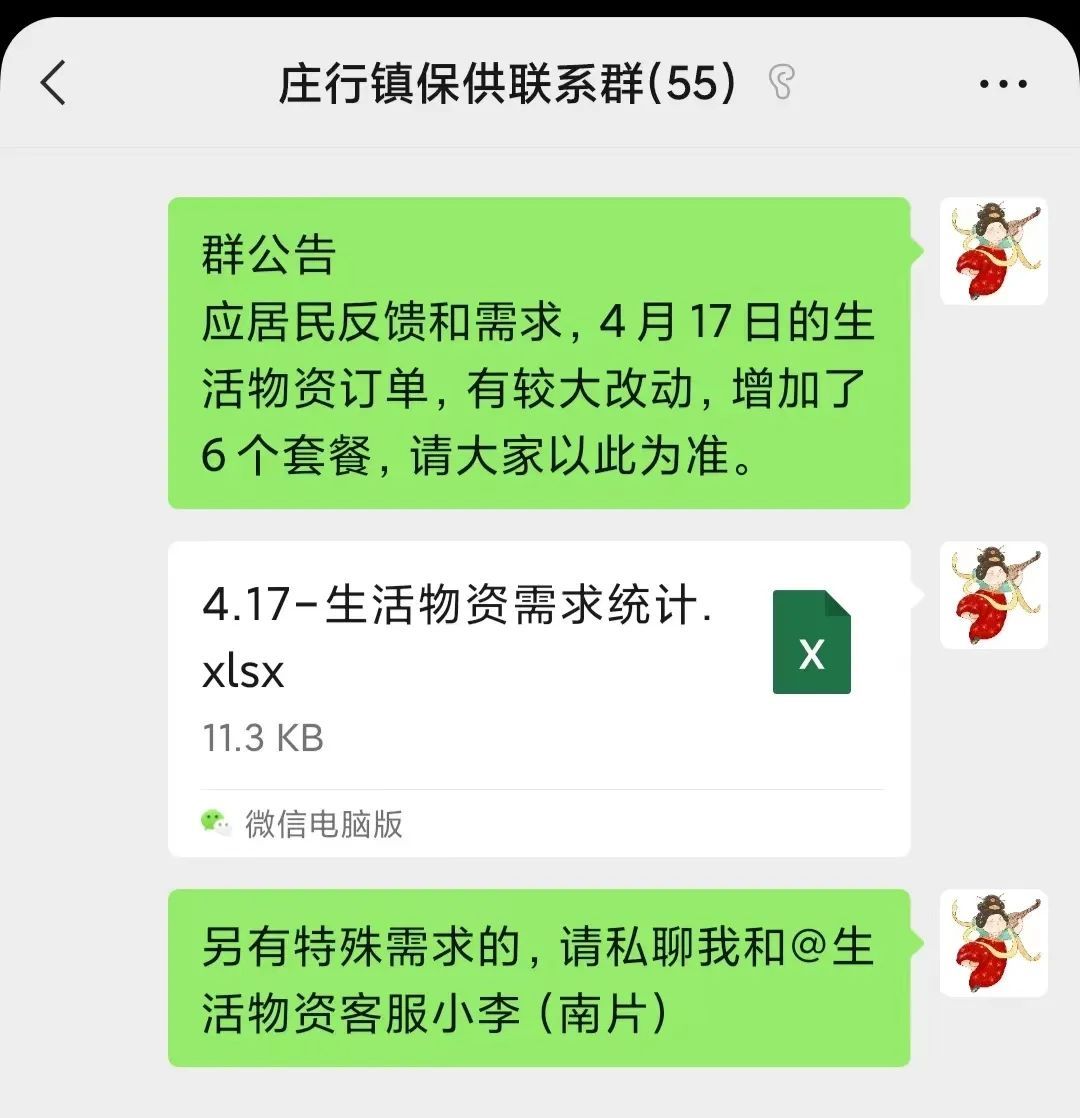 以镇保供小组创建的“星管家”全镇保供联系微信群为平台,推广“村居/园区单日下单-政府部门汇总-超市双日分片配送”的运转模式,村居“星管家”采用“快团团”、网格化统计等方式向群众发布商品和统计订单,镇经发办2名工作人员化身金牌客服,汇总全镇生活物资订单,统一协调下单,在下个报单日前由超市完成配送。