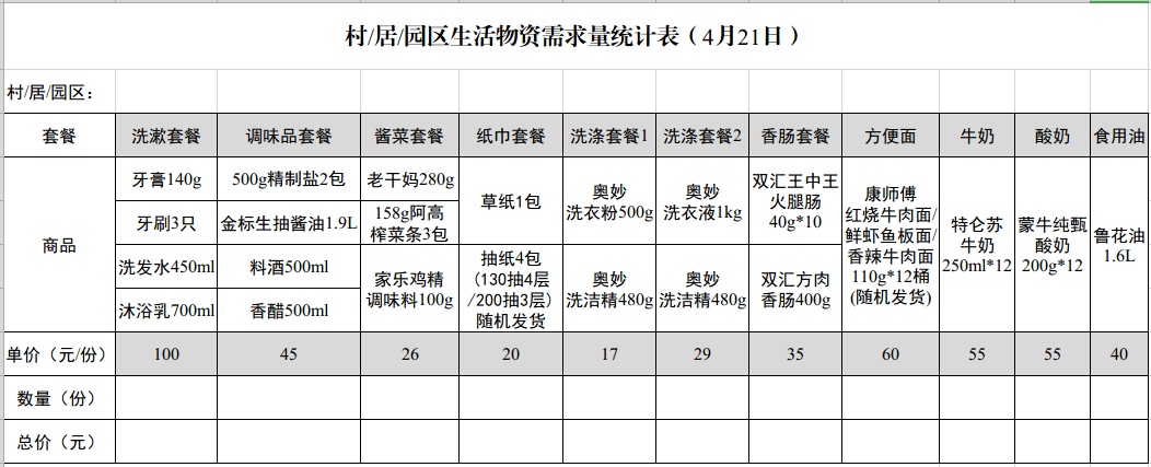 由政府对接超市,就生活物资的商品规格和价格进行协商,以套餐形式供应,减轻基层工作人员和配送志愿者的分拣压力。