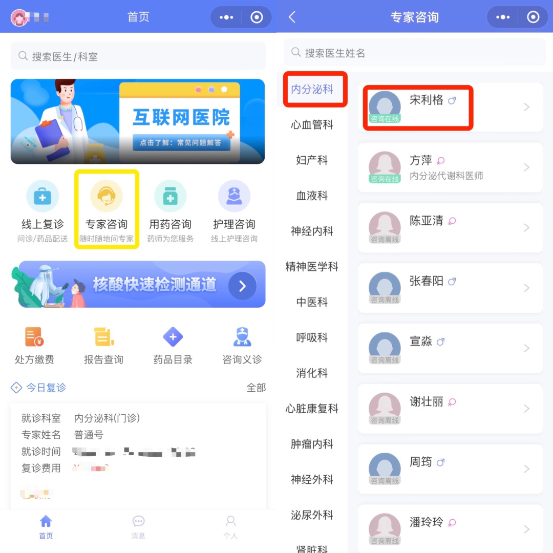 第一步:首页选择【专家咨询】选择要咨询的科室及专家(见图3)