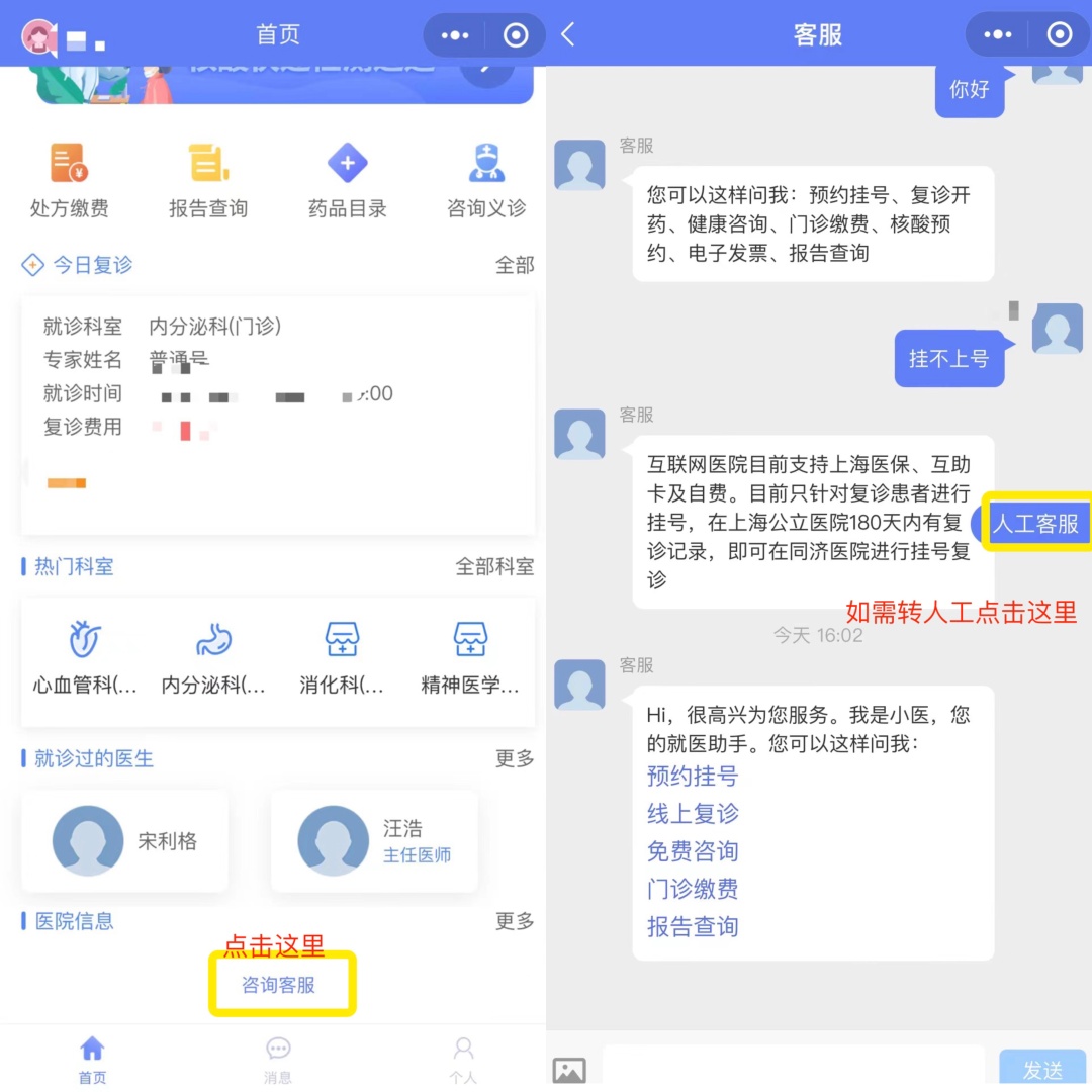 ①线上复诊(为我院复诊患者提供语音、图文、视频等形式在线复诊诊疗、续方购药、药品配送服务 注:目前线上复诊仅支持6个月内在上海市公立医疗机构有就诊记录和用药记录的患者);