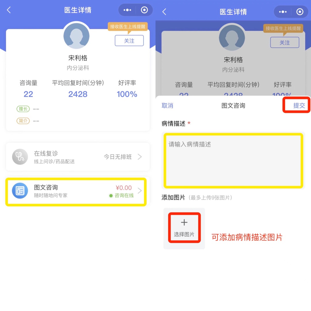 第二步:选择“图文咨询”—在“病情描述”下输入病情描述,也可以添加描述图片(最多可上传9张)点击【提交】(见图4)