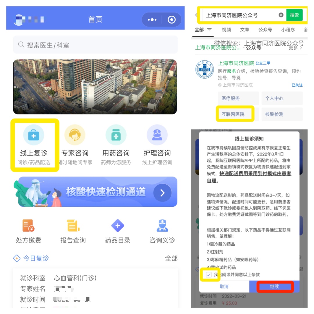 上海市同济医院互联网医院提供在线复诊、专家咨询、核酸缴费快速通道、报告查询服务,优化升级后开通了用药咨询服务以及护理咨询服务,全方位满足患者的居家防护需求。