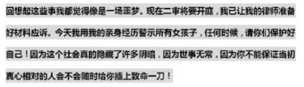“今天我用我的亲身经历警示所有女孩子,任何时候,请你们保护好自己!因为世事无常,因为你永远不能保证当初真心相对的人,会不会随时给你插上致命一刀!”