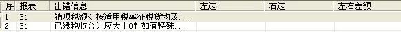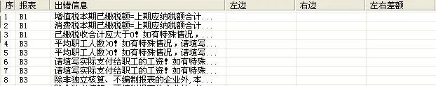 系统将在报表的下侧显示出错信息窗口,罗列出错信息,每一个错误信息由所在报表代号和相应的审核提示信息组成,如下图所示: