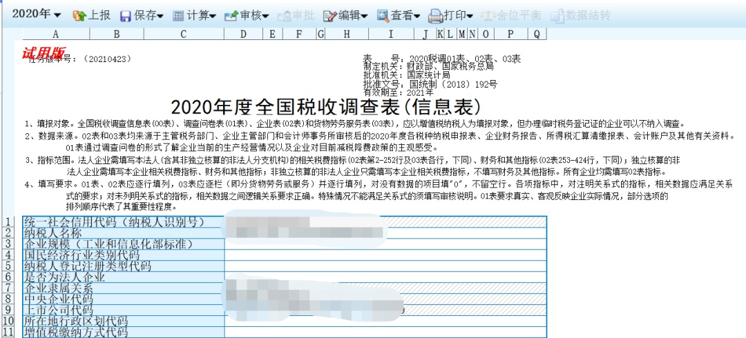 打开填报表单时,在企业已正常(在征管系统里)申报的情况下,系统会将部分税收调查任务指标初始化到填报界面,供企业参考使用。企业可根据实际业务,对已取数的指标进行确认和调整,并补充填报其他指标。