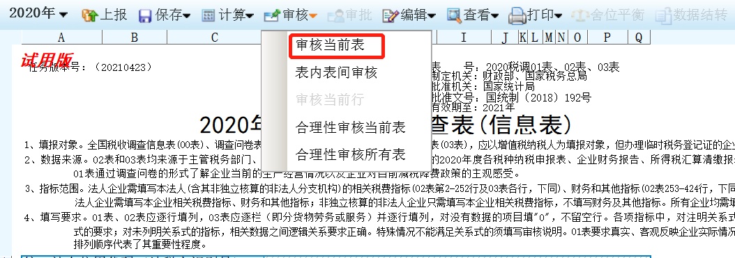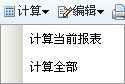 数据填写完毕后,审核数据前,建议对数据进行计算。点击【计算】按钮计算报表中带斜线底纹的公式表元。点击下拉菜单中的【计算全部】实现整套报表的计算,点击【计算当前报表】计算当前报表中的公式表元,如下图所示: