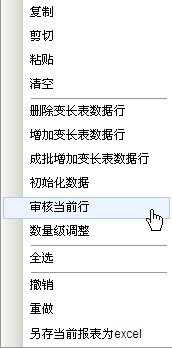 选定某一未通过审核的数据行的任一单元格,点击右键,在菜单中选择【审核当前行】,系统将在审核窗口中显示审核提示信息。根据提示信息修改数据即可。