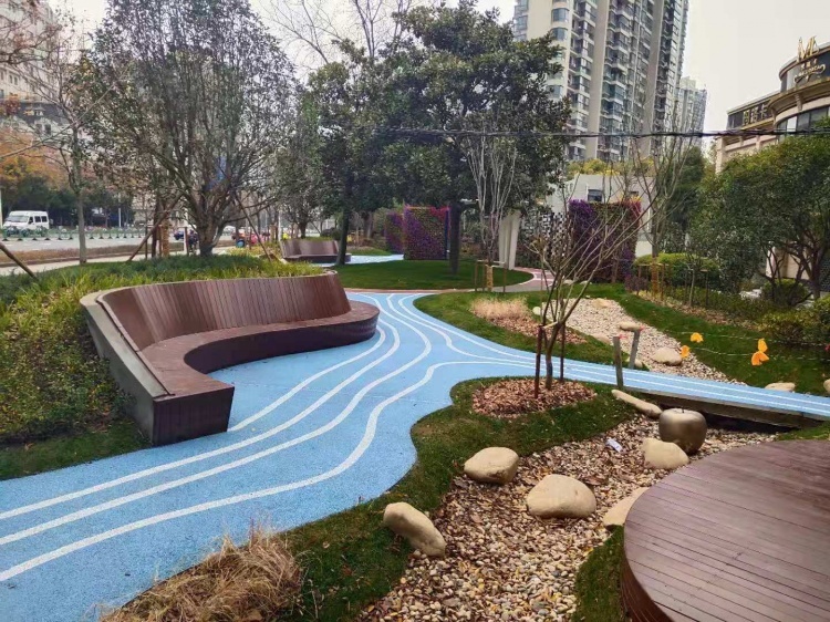 口袋公园新增了长椅,供市民休息;添加了健身步道,满足市民运动需求;还专门设置了一个旱溪,增加口袋公园的元素。硬化路面全部使用透水沥青,路面下还铺设了排水管,即便是遭遇大雨,也不会出现积水。
