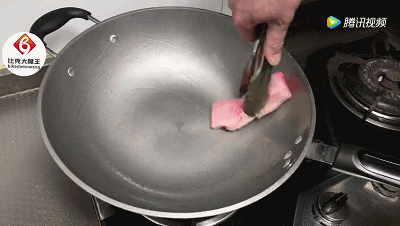 7、将肉放入锅中进行第二次擦拭,直到猪肉变黑,达到润锅的目的。
