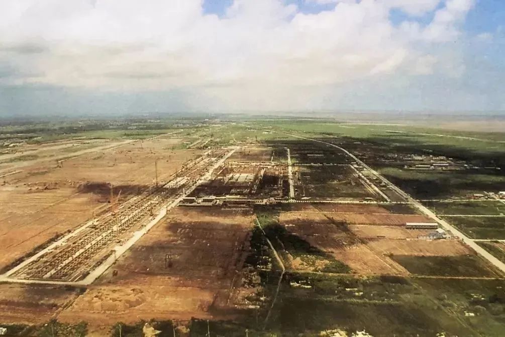 浦东国际机场一期飞行区建设前景象,一片田园风光。