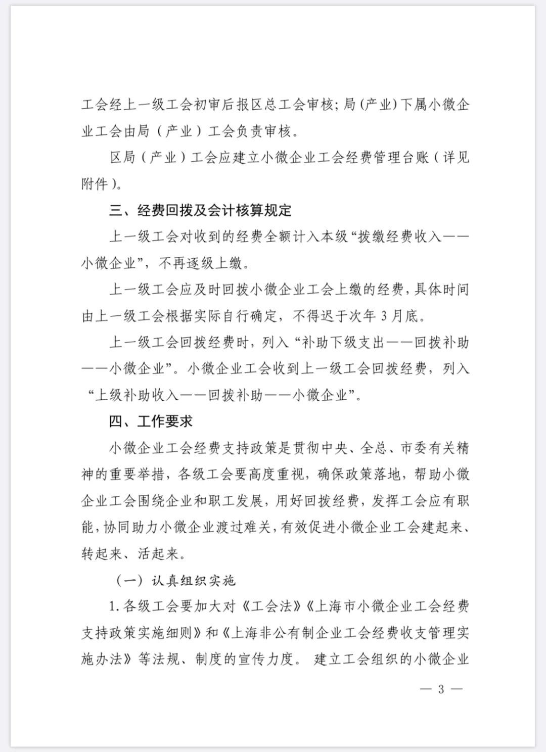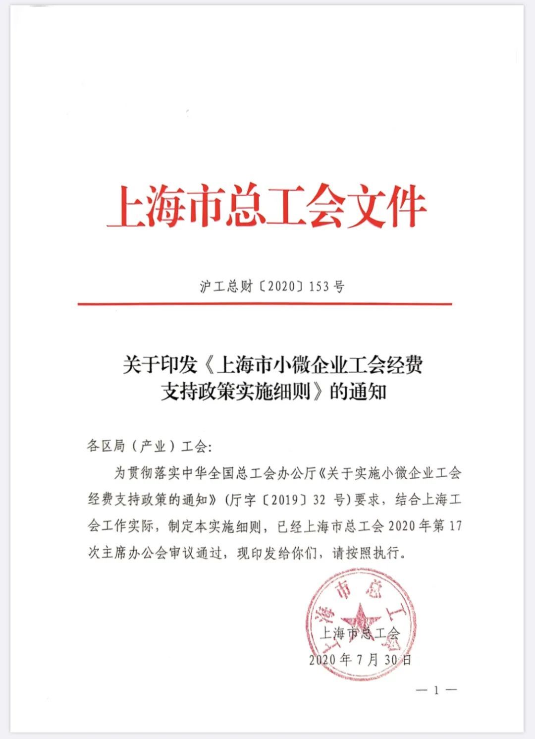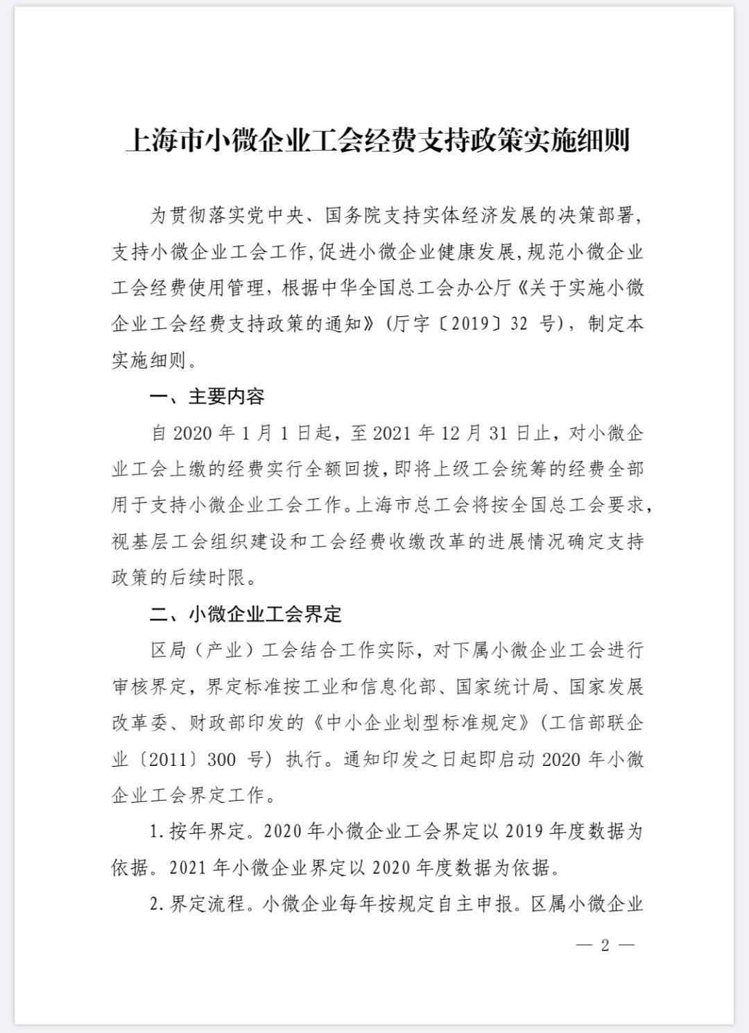 今天,上海市总工会出台《上海市小微企业工会经费支持政策实施细则》,明确自2020年1月1日起,至2021年12月31日止,对小微企业工会上缴的经费实行全额回拨!