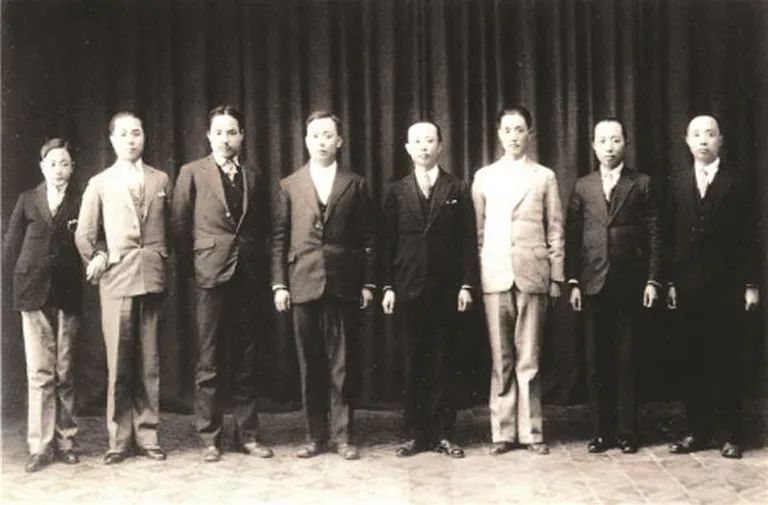 1942年,“黎氏八骏”的父母亲60岁寿辰,“黎氏八骏”在北京合影,从左至右:黎锦扬、黎锦光、黎锦明、黎锦炯、黎锦纾、黎锦耀、黎锦晖、黎锦熙 (资料图片)