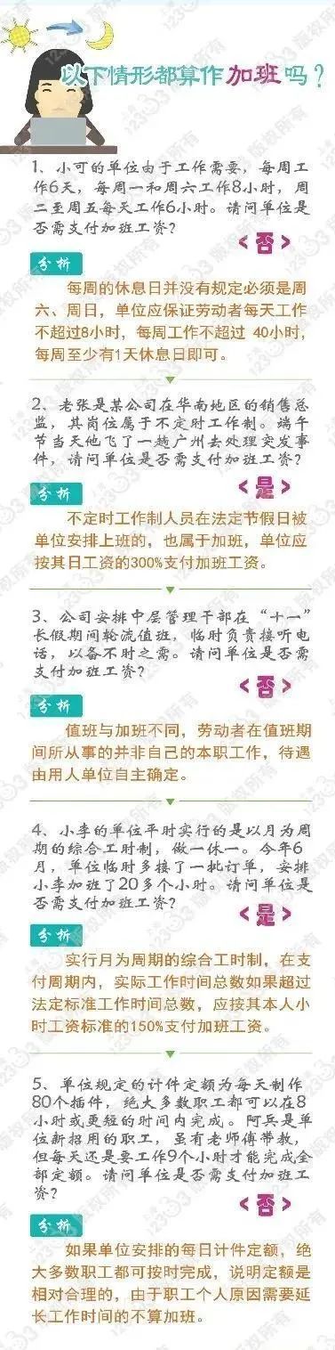 周末工作、法定节假日值班、不定时工作制人员在法定节假日出差等算加班吗?每周的休息日并没有规定必须是周末,单位应保证劳动者每天工作不超过8小时,每周工作不超过40小时;值班与加班不同,待遇由用人单位自主确定;不定时工作制人员在法定节假日安排上班也属于加班。详情↓