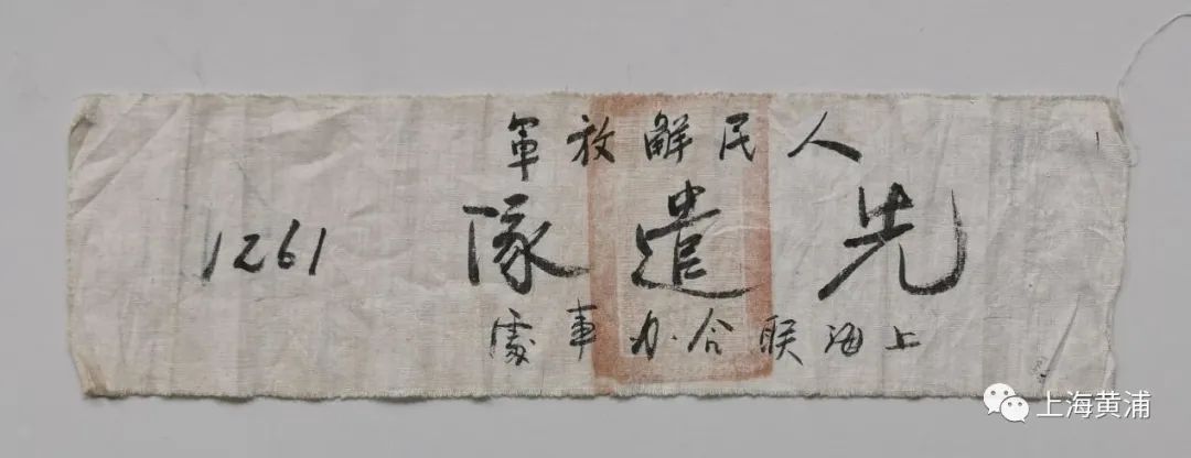 另外还有一枚“上海联合办事处人民解放军先遣队”袖章。郭乃兴先生介绍说,袖章上的文字字迹不同,很可能是因为这些字并非出自一人之手,这个臂章很可能是多人合作完成的。