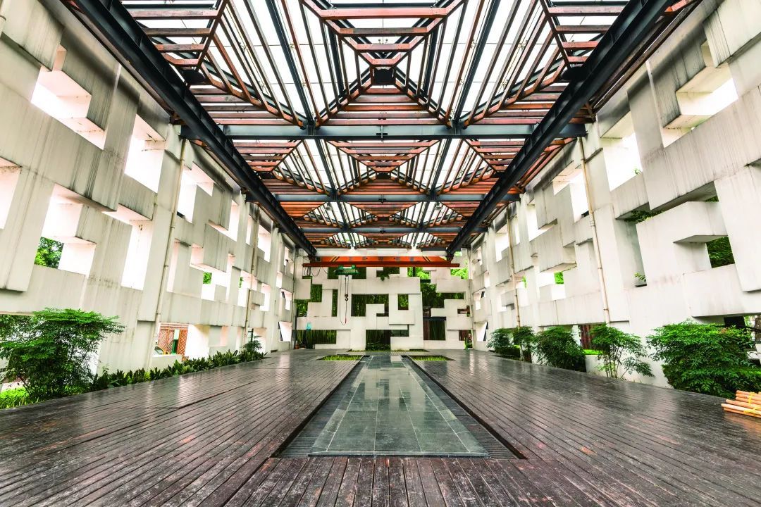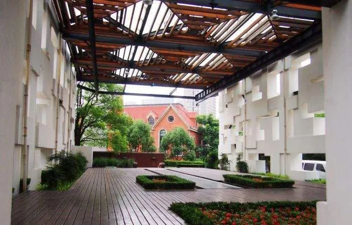 这片绿地不仅名称优美,还是一个景观绿化与市政基础设施建设相结合的工程典范。绿地地下为市政排水泵站和雨水调蓄池,地表是丰富的植物、景墙、廊架、叠瀑、亲水平台,成为苏州河畔一个标志性景点。设计师用grc材料把泵站检修的桁架包裹起来,拓展为具有遮阴避雨功能的高大廊架,下部吊装平台和检修孔改造为水池和木平台,满足临时施工作业与平时游人休憩的功能需求。