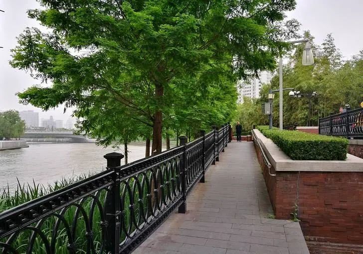 绿地沿苏州河一侧采用高低两级防汛墙设计,设置两层木栈道,供游人观赏苏州河美景。东部以绿化为主,内置篮球场和塑胶跑道,提供健身和慢跑空间。