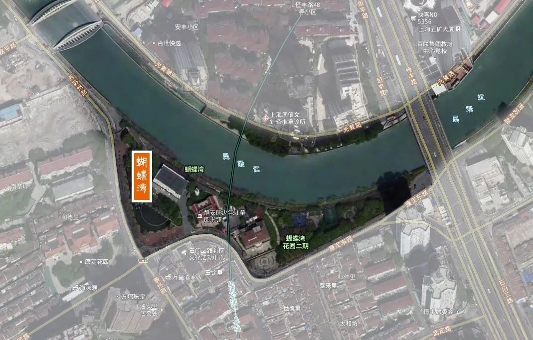 蝴蝶湾绿地位于静安区内,苏州河南岸。其范围东至恒丰路桥,南沿康定东路逶迤蛇形,西至泰兴路,北临苏州河。