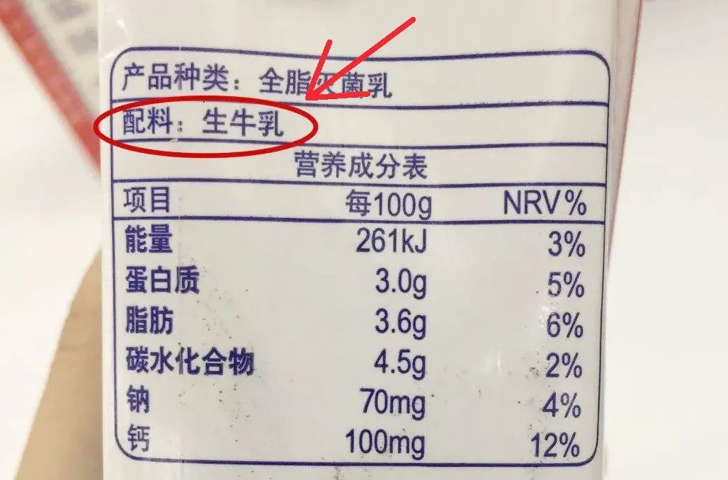 纯牛奶,其配料表中只有三个字,生牛乳!生牛乳,生牛乳!没有其他看不懂的成分。那些早餐奶、调味奶、儿童奶会添加其他配料,不过配料表里也是有生牛乳。