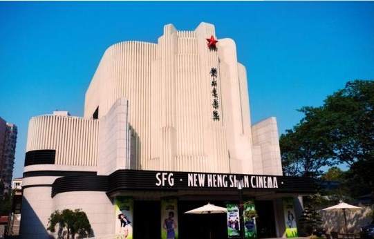 经过修缮的“沪上第一花园影院”衡山电影院在外立面上引入竖状线条,绿意葱茏中展现出一座雪白褶皱纹路装饰的“山形”建筑物,顶层一个大五星,下书“衡山电影院”五个大字。门楣上则是横版的“sfg·new hengshan cinema·”,简约中带有复古。主建筑两侧有两条木栅道,一边是草坪,另一边是长廊,颇显花园影院的感觉。