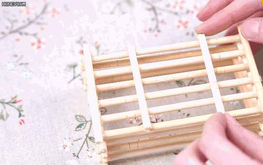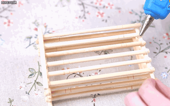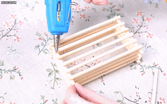 4.然后在每根筷子的两边上面涂抹热熔胶,将两根筷子竖向粘在一起,这样名片盒的底部就做好了;