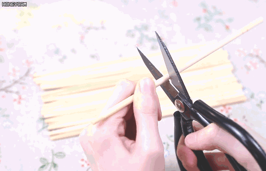 2.用剪刀将一次性筷子,剪成大约12厘米长,底部一共需要六根筷子;