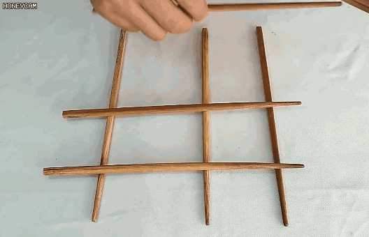 2.横放三根筷子,再在上面竖放三根筷子,摆成九宫格的样子;
