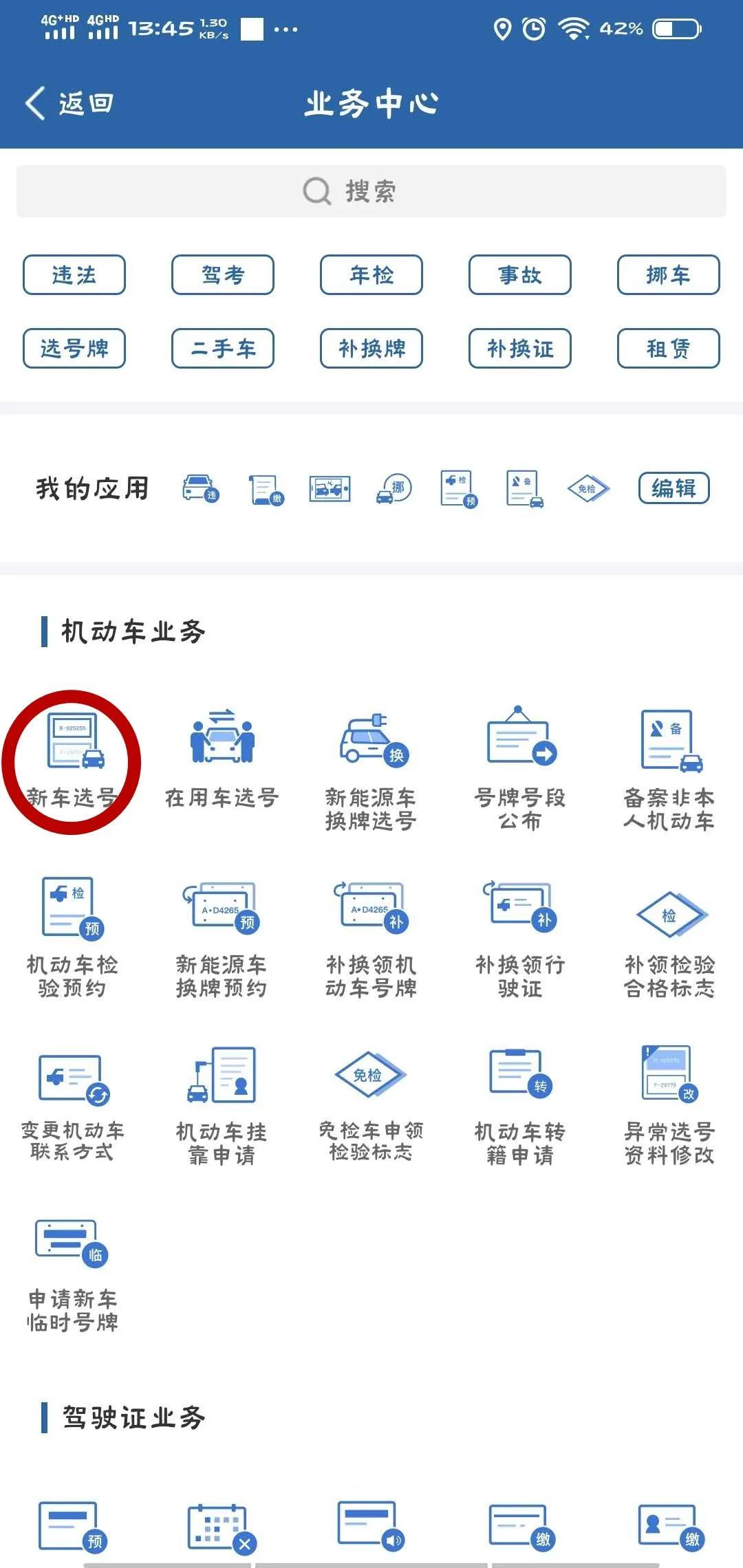 私车额度拍卖中标的车主,可通过“交管12123”app选号,或车管所现场选号。如选择app选号,可以选择自编选号(20选1)或随机选号,如果app选号不满意,可以待五天选号有效期过后,再去车管所进行现场选号1次,等于有两次选号机会。如直接前往车管所选号则只有一次机会。(目前平台仅支持尚未注册登记的小型非运营载客汽车,不含沪c号牌,沪c号牌可去现场选号)