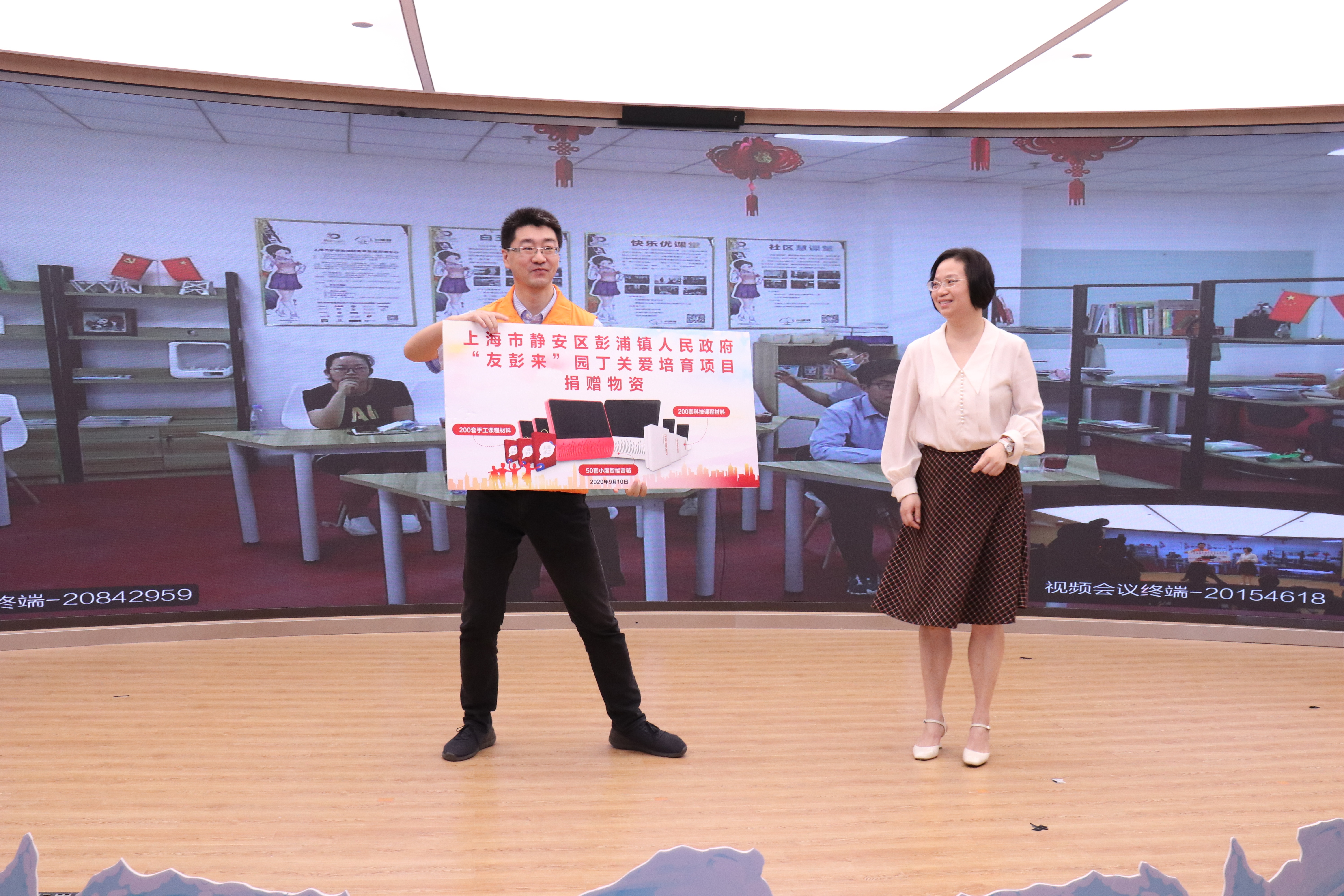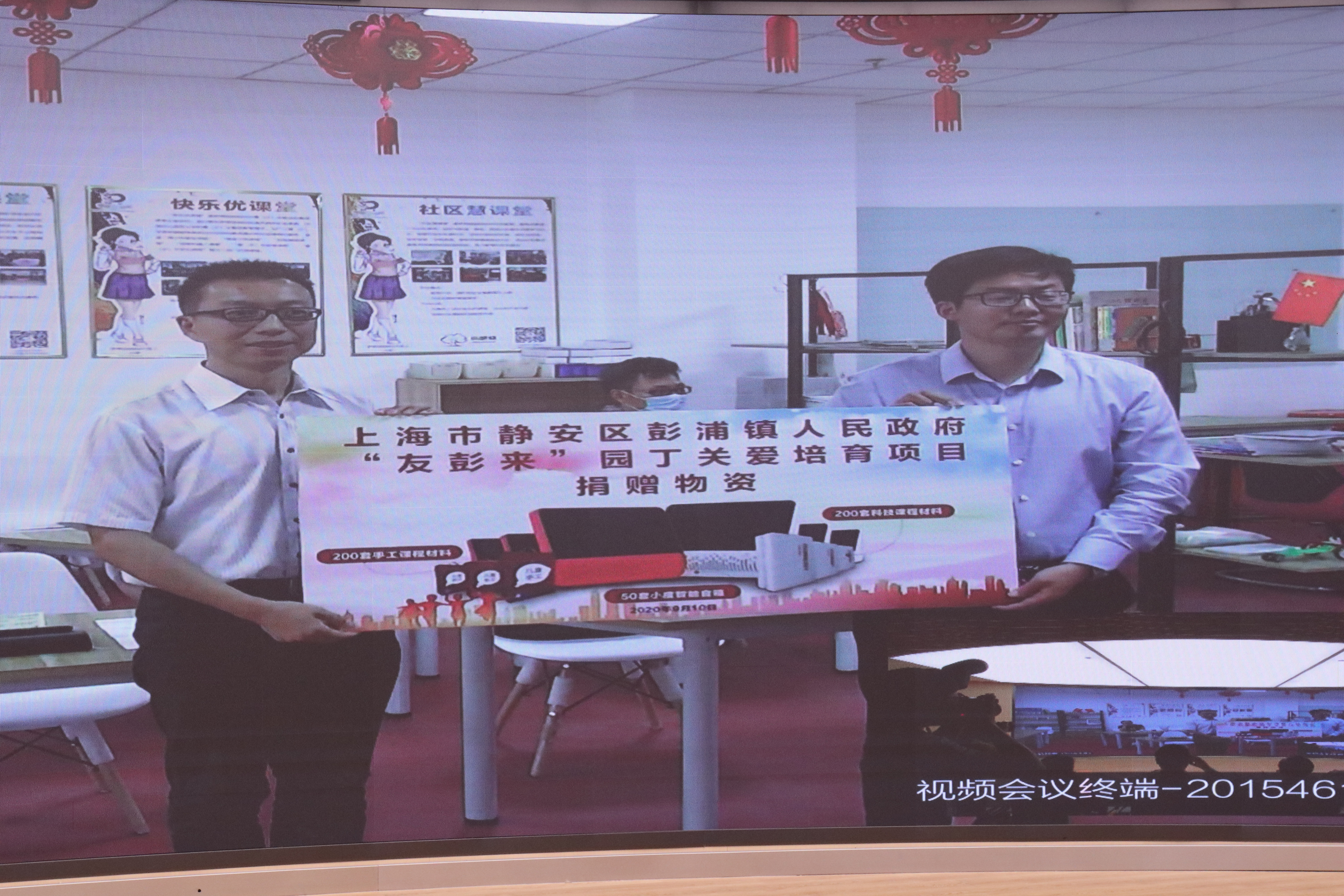 9月10日下午,在彭浦镇庆祝教师节大会活动现场,随着彭浦镇领导经网上连线,将价值4万元左右的科普教具包(含录播课程)、小度智能音响等教学器材和课件,通过“爱心速递”小哥之手,快递给该镇对口援建的新疆喀什地区巴楚县教育局中小学和幼儿园的教师们,至此,由该镇精心打造的“友彭来”园丁关爱培育项目宣布正式启动。
