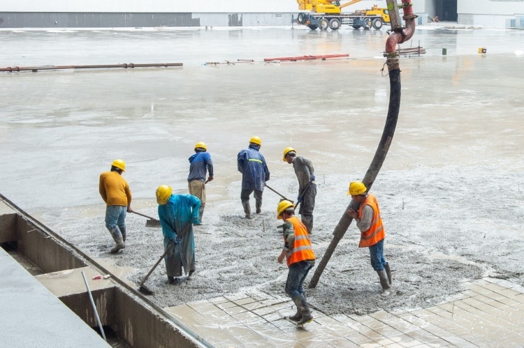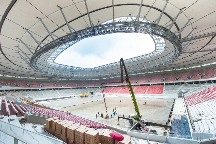 站在看台上,场内一片轰鸣声。场芯区域工程车辆正在浇筑混凝土,数十名工人则在一旁开展场地硬化、防水等作业。