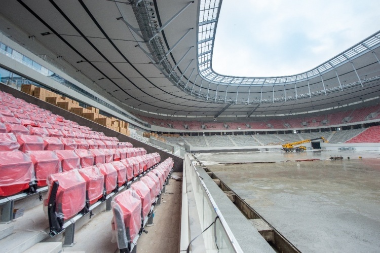 来到看台区域,这里共有上下两层,上层座椅已全部安装完毕,成为一片红色海洋。