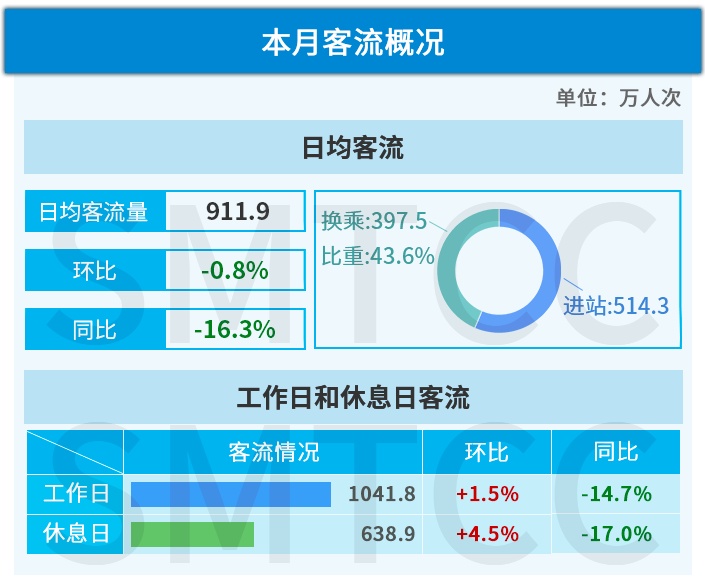 8月轨交全网日均客流912万人次,其中工作日平均1042万人次,环比上升1.5%;休息日平均客流639万人次,环比上升4.5%;由于休息日较7月多了2天,因此8月日均客流环比下降0.8%,同比下降16.3%。