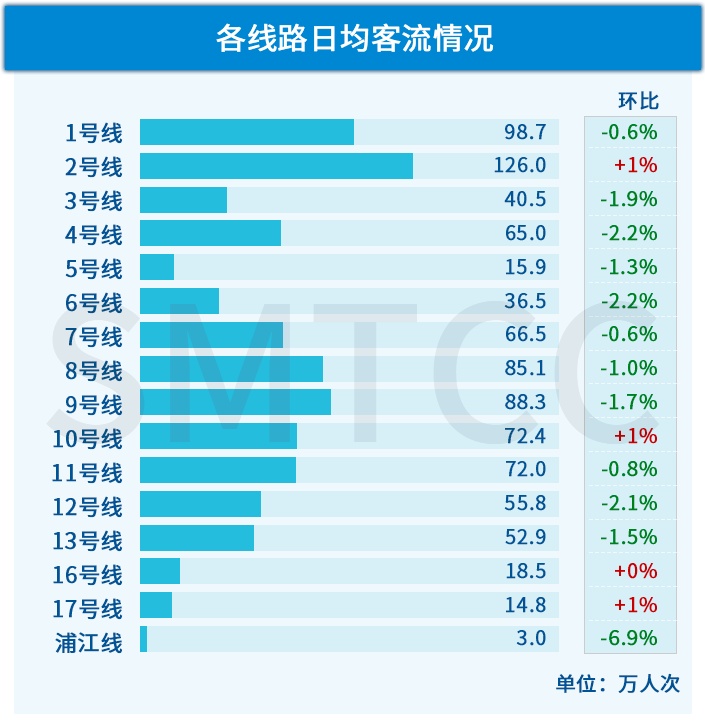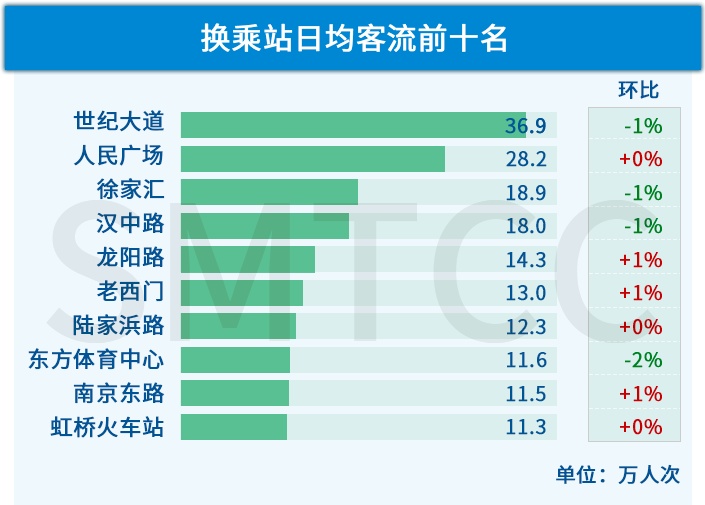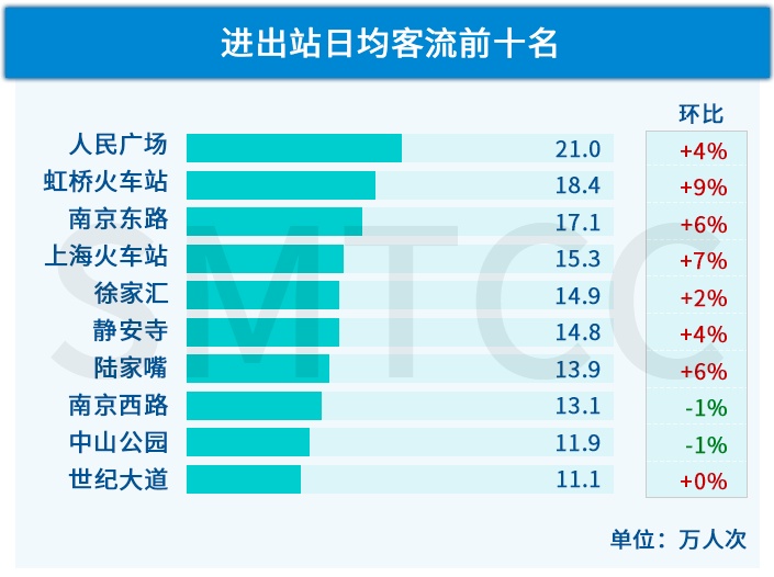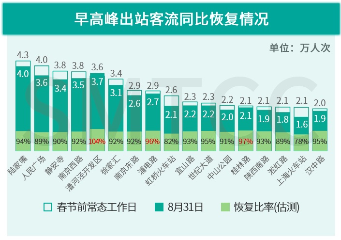 1)核心商务区(陆家嘴、静安寺)及产业园区(漕河泾、桂林路)这类办公密集区域,早高峰站点客流已恢复至疫情前常态的89%以上;漕河泾站更是较常态增长了4%,即已经回到了疫情前原本的上升通道中;