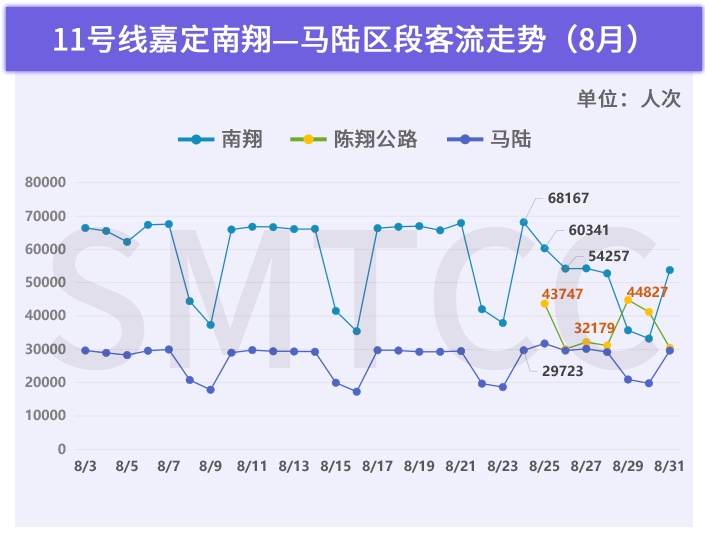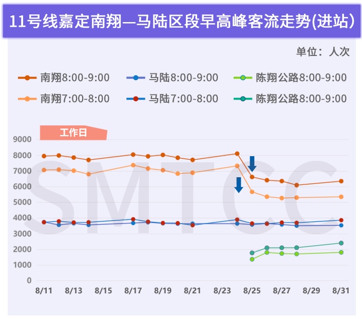 工作日早高峰进站客流变化方面:马陆站同样无任何变化;南翔站8/25起显著下降——7:00-9:00合计降了3000-4000人次,对于南翔站早高峰客流压力,有大约25%的缓解效果。