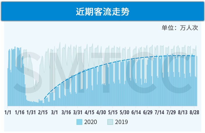 截止8月底,工作日最高客流1086万人次、休息日最高客流707万人次,已分别恢复至疫情前常态的九成和八成。
