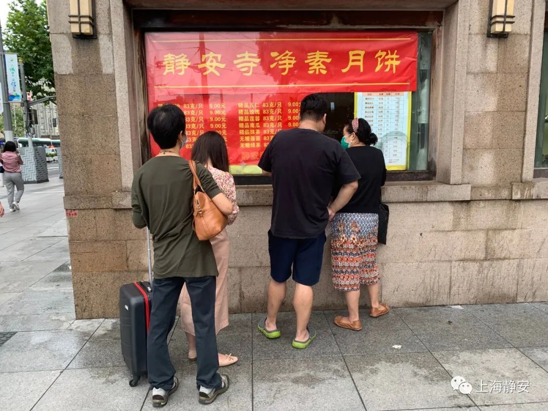 上午9点,不少顾客已在静安寺净素月饼的销售窗口前,排队等候。记者注意到,购买月饼的顾客包含了不同的年龄层。一对70多岁的夫妻表示,比较喜欢这里的五仁、苔条和南瓜这类传统口味月饼。