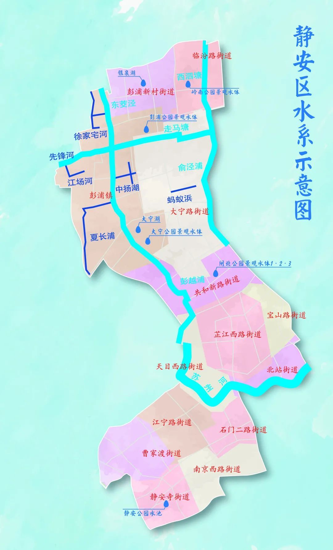苏州河沿岸是上海最初形成发展的中心,催生了几乎大半个古代上海。静安区的东茭泾—彭越浦和走马塘都是苏州河的主要支流。