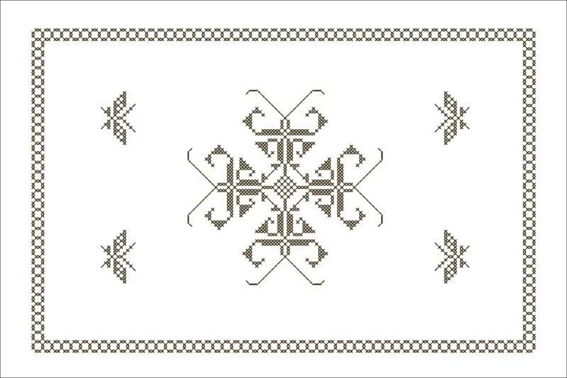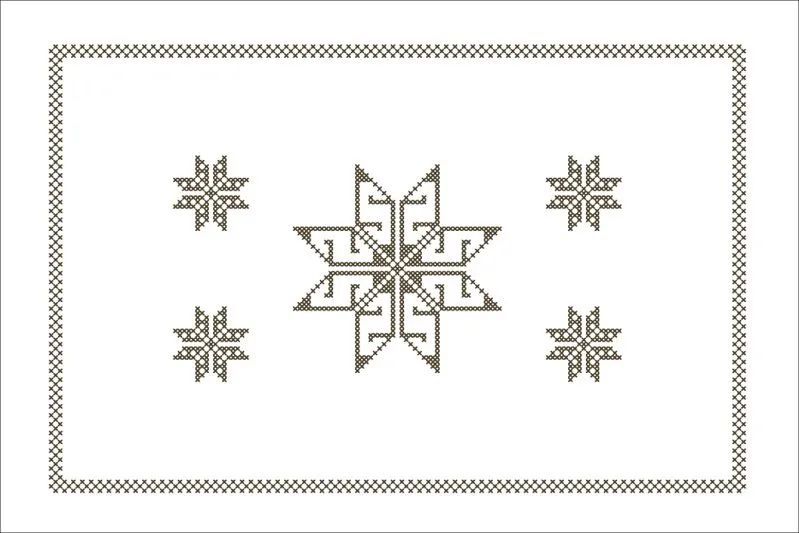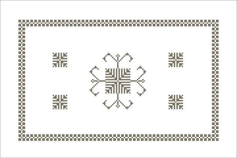 八角花也称八角星,四射的八角寓意着无际的天空,同时象征着光芒四射的太阳。中间的方形图案象征着大地,整个花型寓意着天圆地方,也充分表达了当时人们对于自然的无上崇敬以及农耕文化的体现。八角花是由八个菱形组成,图案的伸展性很强,又能多个组成不同的花型,所以在挑花作品中应用广泛。