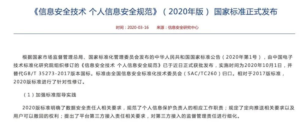 今年10月1日,新版《信息安全技术 个人信息安全规范》实施。《规范》要求,在收集人脸、指纹等个人生物识别信息前,应单独向个人信息主体告知收集、使用个人生物识别信息的目的、方式和范围以及存储时间等规则,并征得个人信息主体的同意。
