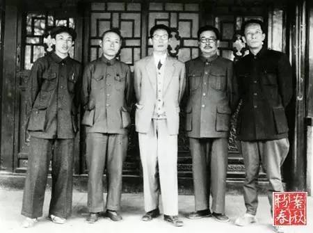 1949年5月初,夏衍从香港北上,在北平李克农家的合影。左起:钱筱璋、阿英、夏衍、李克农、袁牧之(沈芸女士提供)