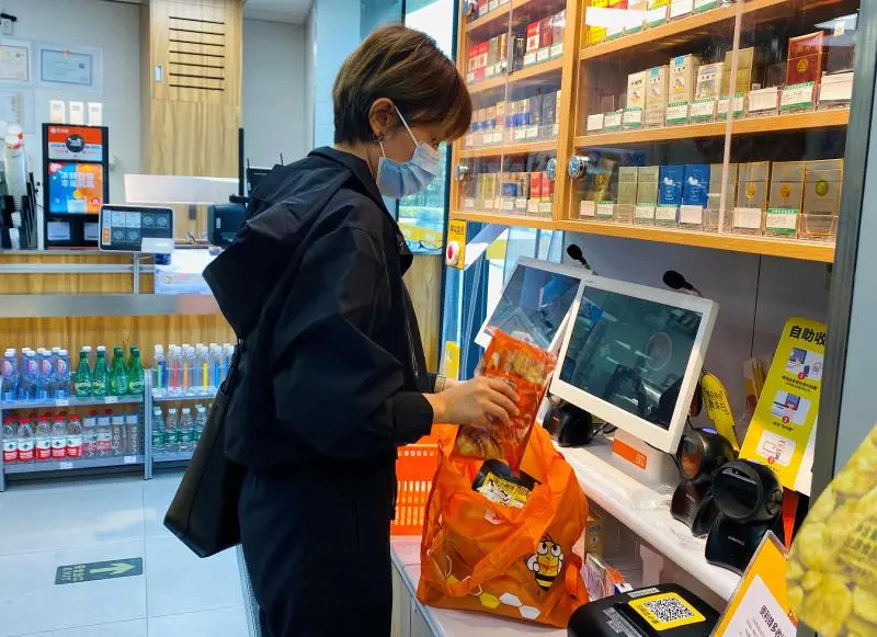 便利蜂超市内,顾客用环保袋(促销价6.45元)打包零食