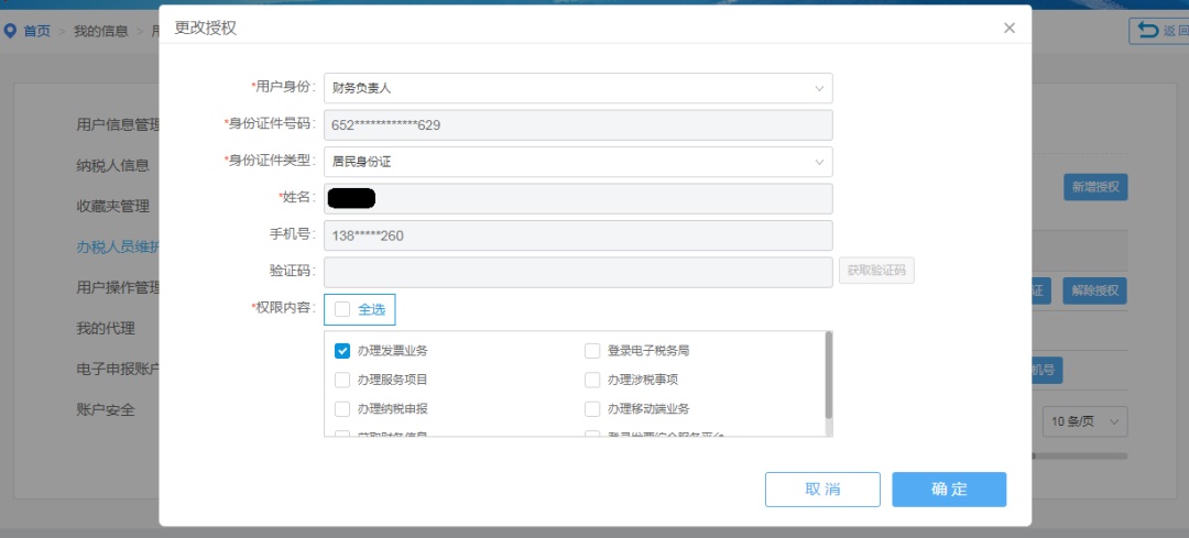 该模块可修改财务负责人手机号,财务负责人无需添加为办税员进行办税,只需要实名认证通过即可办理发票类等需要实名通过的业务,财务负责人也可以修改授权。