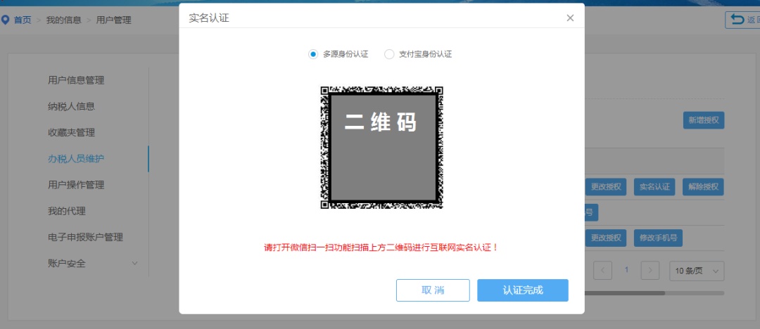 点击“实名认证”按钮,系统展示二维码,“多源身份认证”请打开微信扫一扫功能扫描二维码进行互联网实名认证,“支付宝身份认证”请打开支付宝扫一扫功能扫描上方二维码进行互联网实名认证。按手机上扫码结果提示操作,进行人脸识别实名认证操作。