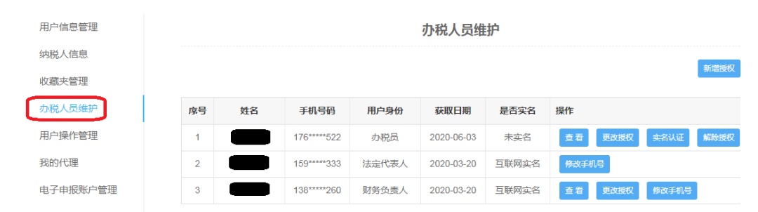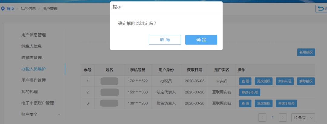 该模块可新增办税员、更改办税员办税权限、解除与纳税单位的绑定、实名认证。