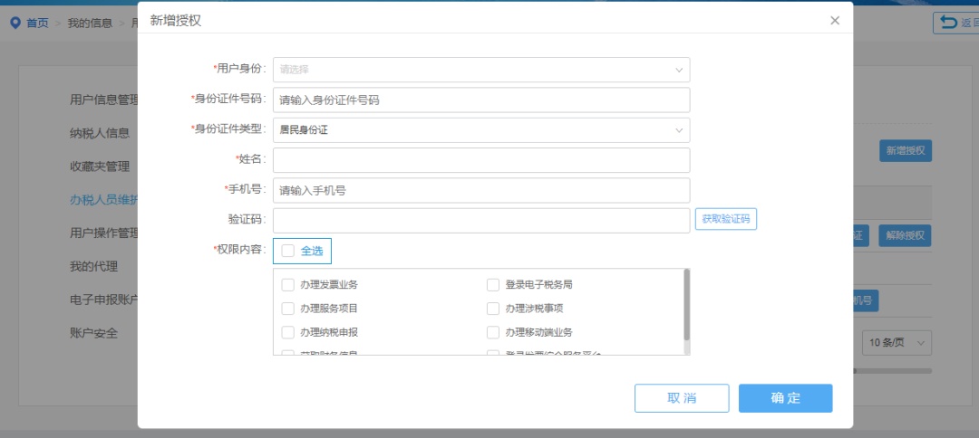 1.点击【新增授权】按钮,进入填写办税人员信息页面。