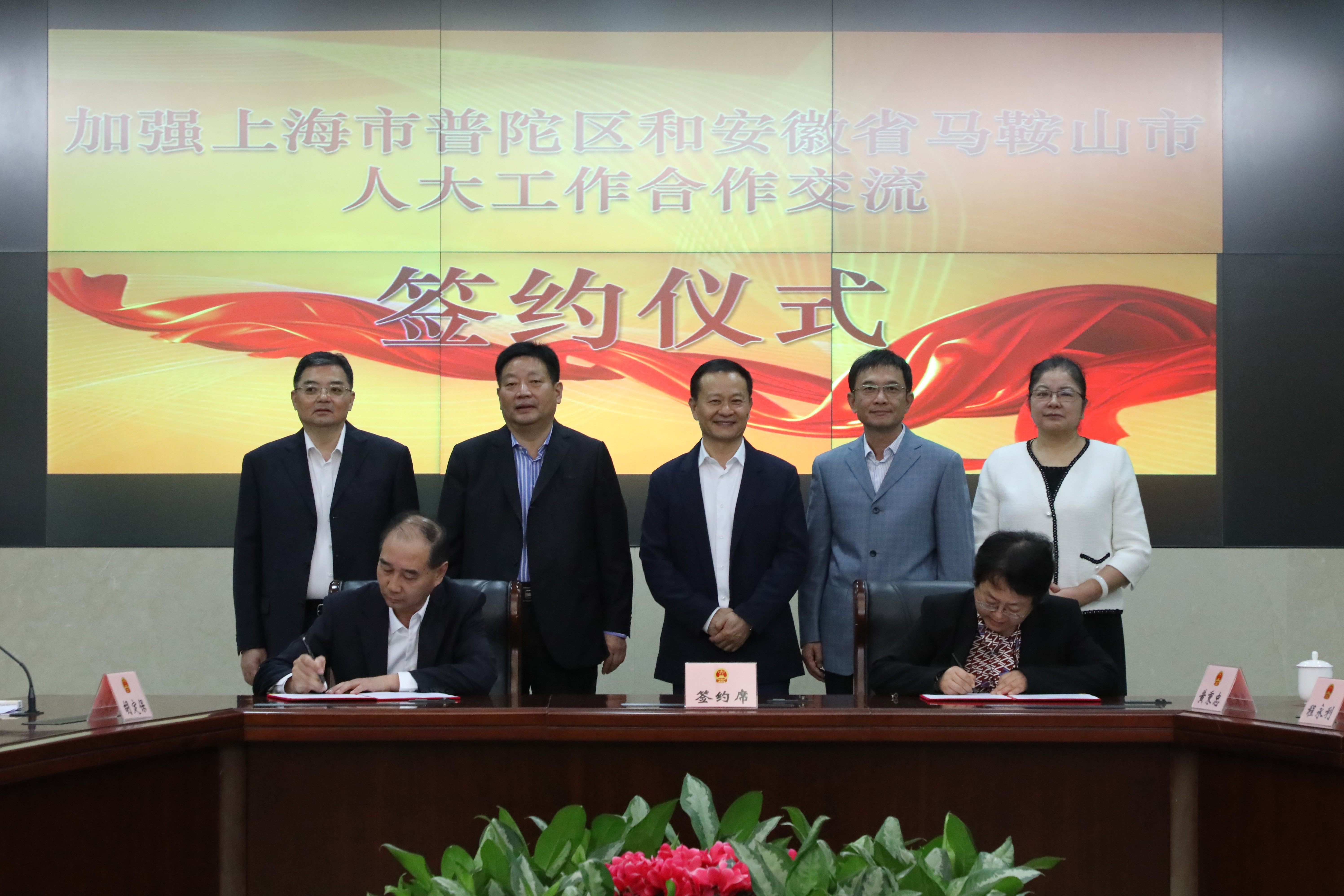 10月20日、21日,安徽省马鞍山市人大常委会党组副书记孙铭和率领马鞍山市人大代表团到普陀区考察并座谈交流,双方签订合作交流协议。区人大常委会主任罗勇伟主持座谈会,区人大常委会副主任张佩卿、李松海、张文瑶,马鞍山市人大常委会副主任杨勇义、卞建秋出席会议,普陀区人大各专委会、常委会办公室负责人,马鞍山市人大常委会办公室、研究室、各县区人大常委会负责人参加会议。